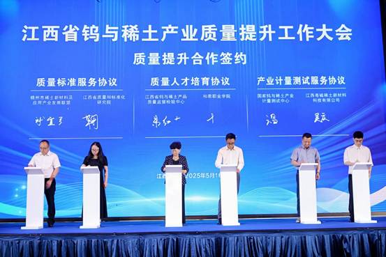 会上,国家钨与稀土产业计量测试中心联合国家钨与稀土产品质检中心等单位与江西省质量和标准化研究院、江西粤磁稀土新材料科技有限公司、和君职业学院就质量标准服务、产业计量测试服务、质量人才培育签订“战略合作协议”,携手钨与稀土产业共同迈向质量提升和高质量发展新征程。
