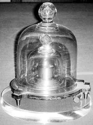 早在我们中学的物理课本中,对质量单位千克的实物基准标准千克砝码原器已做了详细的介绍。那是1871年,法国为了改变质量单位混乱的局面,规定了1立方分米的纯水在4℃时的质量是1千克,并用铂制作了标准千克原器,保存在法国档案局。