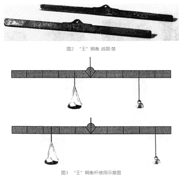 战国时期,墨家以勤劳、刻苦、勇于实践而著称。《墨经》中记述了许多自然科学的知识,其中在对杠杆平衡力学的讨论中,曾以衡杆作为例子,论述了力矩概念。原文是:“衡加重于其一旁必捶(垂),权重(不?)相若也,相衡则本短标长。两加焉,重相若,则标得权也”。对《墨经》这一条中的标点、解释各有不同(此处我们釆用了钱宝琮《<墨经>力学今释》),但有一点大家认识上是一致的,即对不等臂衡杆从理论上作了探讨。这段话的大意是:仅在衡杆的一旁加重物,衡杆必定会下垂。只有权与所加的重物相等时,衡杆才能保持平衡,如果衡杆的支点不在中间,就形成了本(力矩)短、标(力矩)长,即衡杆就不能保持平衡了。这段文字足以证明战国时期《墨经》的作者,对天平和杆秤力矩的原理已有认识。战国时期已广泛使用桔槔提水,就是这一原理在实践中的运用,从而大大减轻了劳动强度。那么,战国时期是否已有了与今天的杆秤相似的衡器呢?目前还没有任何迹象可以证明。但是介乎于天平与杆秤之间的一种衡器,有可能比较早地在某些地区使用了。据报道,国家博物馆里收藏着两件战国时期的铜衡杆,正中有鼻纽,杆面刻十等分,全长相当于战国时的一尺(见图2)。考证者认为,这是一种经过改进后的天平衡杆,它既可以将物与权悬挂在等距离的两端,作天平使用,又可以将两者置于不同位置,从衡杆上的不同刻度和权的标识计算出被称物的重量,近似于杆秤(见图3)。这种设想对不对呢?除了等待更多的地下发掘品加以证实外,还可以从与我们祖先处于同一历史阶段的少数民族中去找答案。带着这个问题,我们走访了中国社会科学院考古研究所。一位曾在20世纪五六十年代到云南边区,对当地少数民族度量衡进行过一些调查的同志,热情地向我们介绍说:在一般情况下,土著民对量的概念是比较模糊的,往往没有一个固定的标准量值,在分配和交换时,对物品的多少、轻重都不甚计较,但群众中也有一些简单的度量衡工具。如有一次,他们采访了一户土著民家,正巧碰上另一位村民来借当地比较珍稀的盐巴,主人便用一根提纽在中心的木衡,一边垂重物即“权”,再将来者所借出的盐放在横杆的另一端,“权”来回移动,直至横杆保持平衡后,再在置“权”的位置刻一横线作记号。主人这一举动引起了调查者的极大兴趣。主人说,这支简陋的“秤”是他自己做的,必要时偶尔用一次。待借物者归还时,只要把“权”仍置于所刻横线处,便可以得到与所借出时重物相似的物品了。这种使用方法,在原理上与国家博物馆那一支横杆有几分相似。