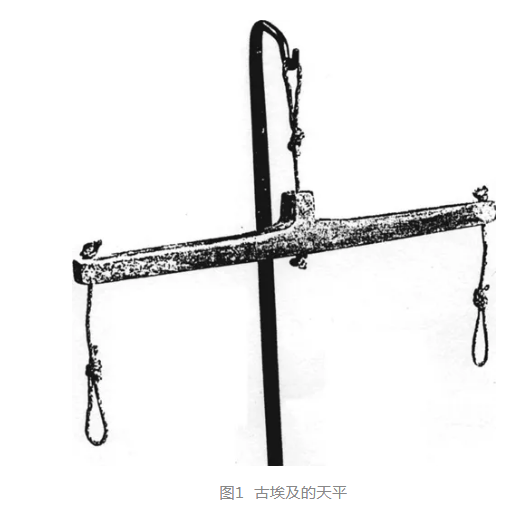 目前所见世界上最早的称重工具,是公元前2500年古埃及的天平(见图1),它的支点在正中,称重时当重物与已知量相等时,衡杆自然取平。对此,古人从日常生活积累的感性认知上完全可以认识到。因此早期制造天平,并非都一定要对力矩原理有所理解。这一点从中外早期的文字和符号上可以看到。
