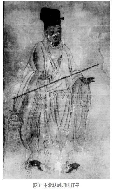 南朝著名画家张僧繇(you)所画二十八宿(xiu)神仙像之一的执秤图,给我们留下了早期杆秤的形象(见图4);秤的一端系盘,秤纽仅略偏于盘的一边,约占全杆的五分之二强。杆的臂比关系相差不大,由此看来,秤砣与重物之比相差也不会很大。此外,敦煌莫高窟北魏壁画《尸毗王本生图》中掌秤者所执之秤,支点的提纽也只是略偏于被称物一边。从这两幅画中也可以看出,在此期间,杆秤还没有发展到很成熟的阶段。