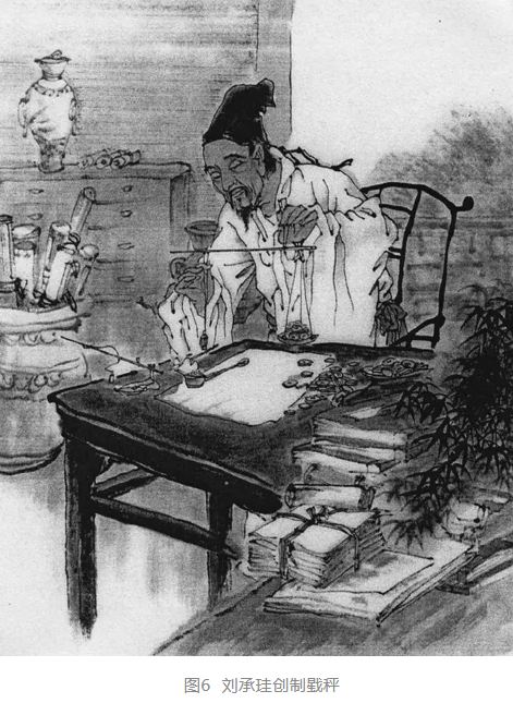 北宋初为了控制地方财政,中央下令各州郡的税收,除地方留必要的开支外,所有的钱币(银两)、绢帛都要送至京师。太平兴国二年(公元977年)前后,连续发生内库和外府受纳各州县上缴的银两,账目差错不断发生。一度只归结为斗秤仓吏欺压秤盘,贪赃为奸。为此入狱乃至家破人亡者甚众,案件查办达11年之久,仍无实据。至景德年间(公元1004~1007年),宋真宗赵恒下诏重新划定度量衡,令掌管皇族内府库藏的官吏刘承珪负责办理。刘承珪检定了当时宫廷所藏最高一级标准砝码,从一钱至十五斤的五十余枚,经过反复校验后,发现这些器具本身并没有一个统一的标准,而在宫廷外,政府向地方收取金银税赋时,则要求自毫厘计之。由于官府所藏砝码最小量值仅始于钱,标准又无定制,致使弊端重生,百姓叫苦不迭。刘承珪经过一番调查研究后,提出要整敕度量衡必须追本溯源,参照历代的记载和实物,重新制定权衡标准。秦汉时重量最小单位是黍,10黍为1累、10累为1铢、24铢为1钱,久而久之逐渐约定俗成,“钱”作为一个重量单位而通行了,继而十钱为一两的进位制被官民习用。到了宋代初期,这两种单位仍并用。刘承珪正是利用了这两种衡制,来重新校准权衡标准的(见图6)。第一步:废除黍、累、铢这些非十进位的古制,正式确定10钱为1两,钱以下设分、厘、毫,均为十进位。第二步:采用古今两种不同的单位制相互校准,以求得统一的单位量值。具体做法是:以一两为基数,精心制造4支不同称量的杆秤,以其中两支为例:一支以两、钱、分、厘为单位,另一支以两、铢、累、黍为单位,每一支秤都有3个提,以便扩大量程。我们仅各取其中一支,以中纽为例,简单加以说明。第一种:从零点至秤梢量程是一钱,以秤星为分度线,錾成十等份,每一份准为一分,每一分再析成十厘,这样就可以得到钱、分、厘、毫的量值了;第二种:从零至杆梢为五钱,錾成十二等份,每等份为一铢,每铢之间析成五等份,每一等份为五累,用两支特制的小杆秤,相互校准小量值的砝码,再用淳化年间制造的铜钱,选出其中每枚重量为二铢四累(一钱)的标准钱币共2400枚,又用这些标准钱去校准15斤秤。经过这样反复校量,终于建立了一套更为合理、精确的权衡标准器。《宋史·律历志》详细记载了当时建立这一套国家级权衡标准的每一个具体步骤和方法,这些文字资料从另一角度说明了我国古代建立度量衡标准时,是通过各种途径、釆用各种方式去追求、去探索的。