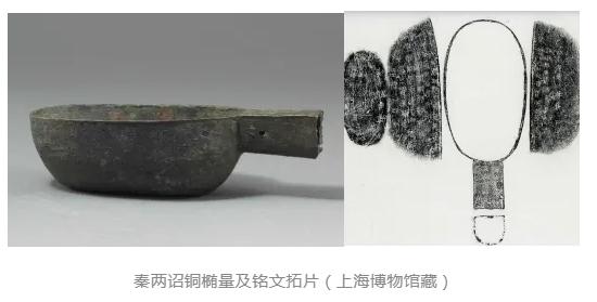 中国计量大学计量博物馆馆藏一件汉刻铭铜量(被吴镇烽收录于《商周青铜器铭文暨图像集成三编》(第四卷),上海:上海古籍出版社,2020年,第334页),国家三级文物。口呈椭圆形,直口,口沿外撇,腹壁向下渐收,平底,一侧有短柄,柄上平面,且与器口平齐,下部作弧形,柄下部铭文:“今一斤四两”,内底部有“□”符号,柄内有朽木痕迹,今实测重299.64克,通长16cm,口长11.1厘米,口宽7.9cm,高4.3cm,容194毫升,约合汉一升。该件铜量,为我们研究汉代量器及考订量值提供了新的实物资料,还在一定程度上反映了汉代的政治、经济等方面情况。