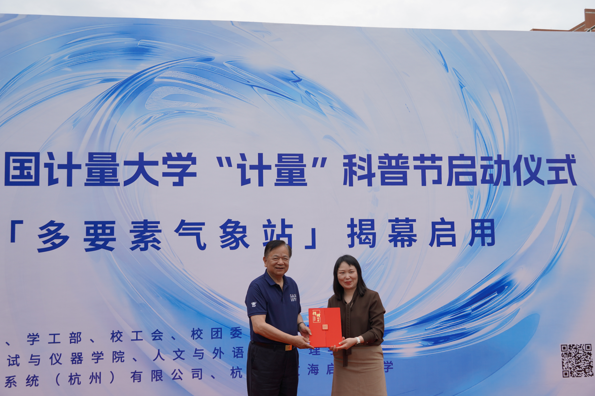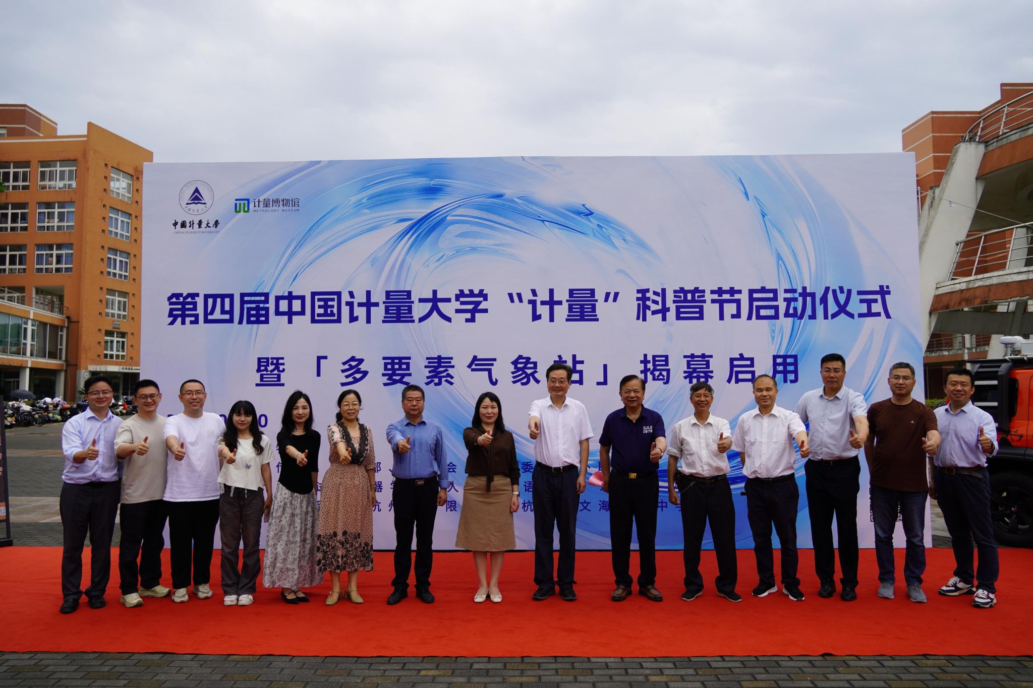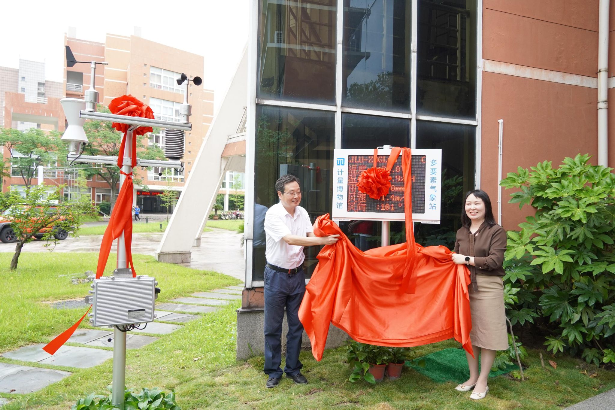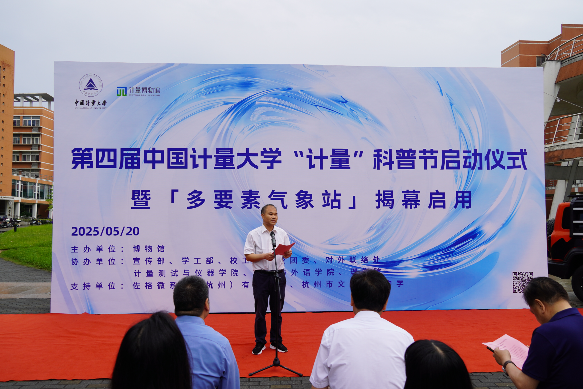 5月20日上午,在第26个世界计量日之际,第四届中国计量大学“计量”科普节启动仪式暨"多要素气象站" 揭幕启用仪式在计量博物馆一楼广场举行。校党委副书记程刚、校友总会会长冯时林、佐格微系统(杭州)有限公司副总经理叶莉芳、杭州市文海启源中学党委书记倪李松等嘉宾,校宣传部、学工部、对外联络处、工会、团委、计量测试与仪器学院、理学院、人文与外语学院、图书馆(档案馆、博物馆)等相关负责人、师生代表出席,活动由图书馆(档案馆、博物馆)馆长郎杰斌主持。