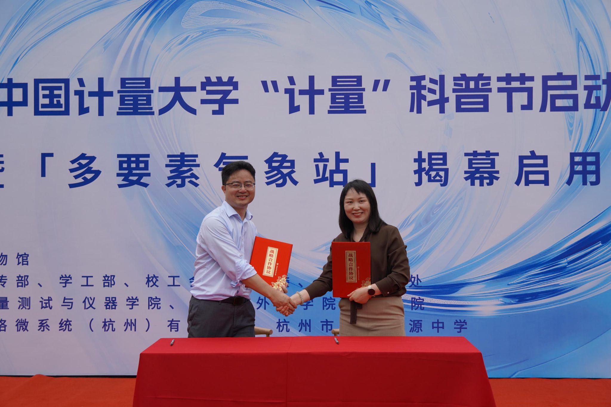 活动期间,图书馆(档案馆、博物馆)副馆长虞华君与佐格微系统(杭州)有限公司副总经理叶莉芳代表双方单位签署了战略合作协议。佐格微系统(杭州)有限公司作为一家专注于大气探测、环境仪器、计量仪器和先进系统的制造商,后续将与我校在气象计量科普、计量文化传播等领域,共同开展各类科普宣传与实践活动。